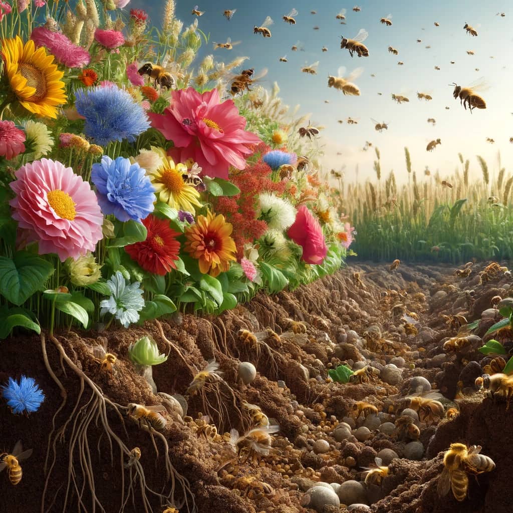 Se for deg forholdet mellom jord og blomster: Fruktbar jord krever et mangfold av blomster, som igjen er avgjørende for insektenes overlevelse. Dette mangfoldet støtter insekter som pollinerer planter, noe som er essensielt for matproduksjonen vår – alt fra grønnsaker og frukt til kornsorter. Tap av fruktbar jord og blomsterdiversitet kan derfor føre til en nedgang i insektpopulasjoner, som igjen kan svekke plantenesen evne til å reprodusere seg.